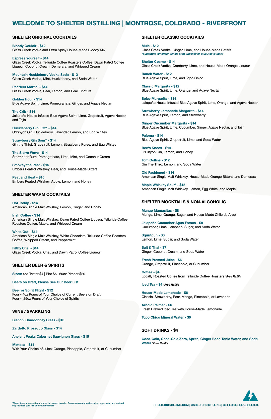“In our quest for adventure and innovation, we've found the perfect location for our expansion—a space that seamlessly blends retail and production into one,” said Shelter Co-Founder, Master Distiller, Jason Senior. “Here in Montrose, we utilize locally sourced ingredients and access exceptionally fresh, pure water for distilling. The results are premium spirits our fans never tire of—just like another run down the mountain or hike through the woods.”
